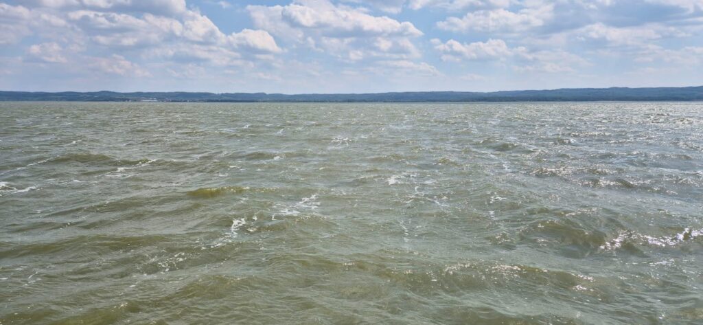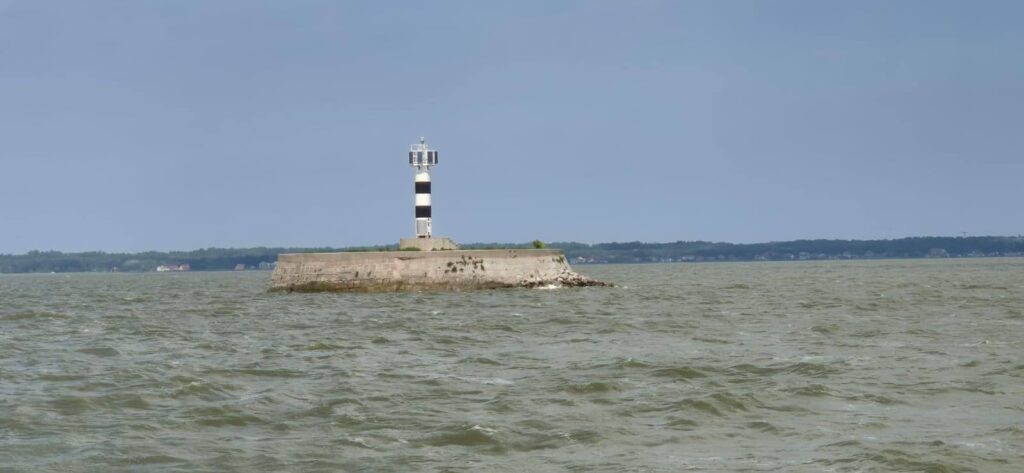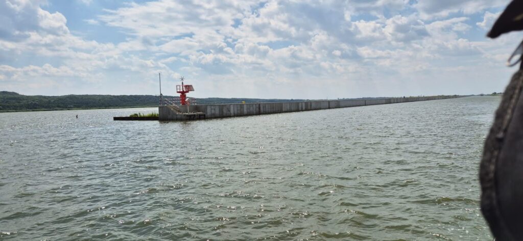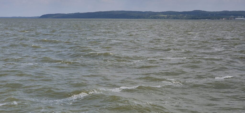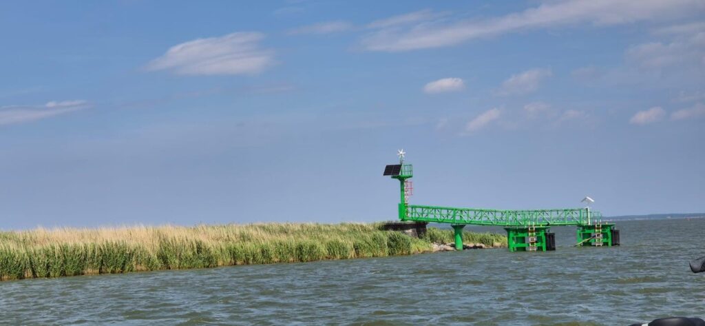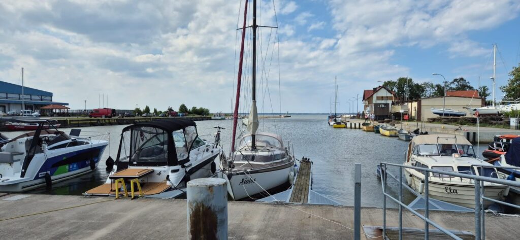 Po wejściu na Zalew Wiślany zaczyna mocniej wiać – wg aplikacji Windy wieje z prędkością 40 węzłów ( 20m/s ), fala około pół metra, temperatura 25 stopni. Głębokość toru wynosi 2-3 m. Załogant z każdą chwilą robi się podobny do wody z zalewu (zielonej) i udaje się pod pokład. Tak, leżąc z zamkniętymi oczyma dociera do wejścia portowego. Kapitan natomiast ma się świetnie, korzysta z lornetki i map i bez problemu odnajduje tor podejściowy do portu w Tolkmicku. Na torze rybacy rozciągnęli sieci – oznaczenia znamy bowiem rok temu będąc w Krynicy dostaliśmy od rybaków instrukcje. Można płynąć miedzy bojkami z 2 chorągiewkami. Miedzy bojkami z pojedynczymi chorągiewkami i miedzy pojedynczymi a podwójnymi lepiej nie przechodzić. Na wszelki wypadek omijamy sieci. skracając tor podejścia do portu. Chorągiewki są czarne i czerwone i są tuż nad wodą, trzeba ich szukać na zalewie płynąc bo potrafią jak dziś być na głównym torze wodnym zalewu. Co tam żeglarz, ryby ważne. Dzwonimy do bosmana i zgłaszamy wejście. 55 231 66 14, 512 071 265. Bosman wskazuje miejsce i pomaga w cumowaniu.