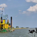Po wyjściu z portu skręcamy w lewo i kierujemy się na północ. Po obu stronach widać intensywne prace, które są związane z przygotowywaniem toru dla dużych statków wpływających do Elbląga. Na mierzei, w porcie Nowy Świat zacumowała już specjalnie skonstruowana pogłębiarka URSA. Z ciekawostek doczytaliśmy, że przy silnym wietrze północnym rzeka Elbląg zmienia swój nurt, wiatr wpycha wody z zalewu do rzeki i następuje zjawisko cofki.