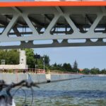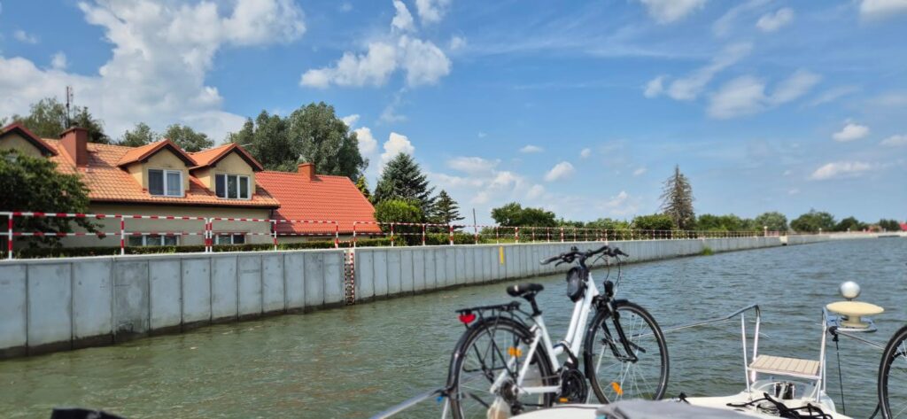 Po lewej stronie mijamy wejście do kanału Jagiellońskiego, który łączy Nogat z rzeką Elbląg oraz most w Nowakowie. Kiedyś był to most pontonowy i miał określone godziny otwarcia. Dzwonimy do mostowego i okazuje się, że jest już nowy mostek, którego prześwit wynosi 5 m tak więc nie czekamy i spokojnie płyniemy dalej. Rzeka ma szerokość 50-60 m, niebezpieczne miejsca oznaczone są kardynałkami.
