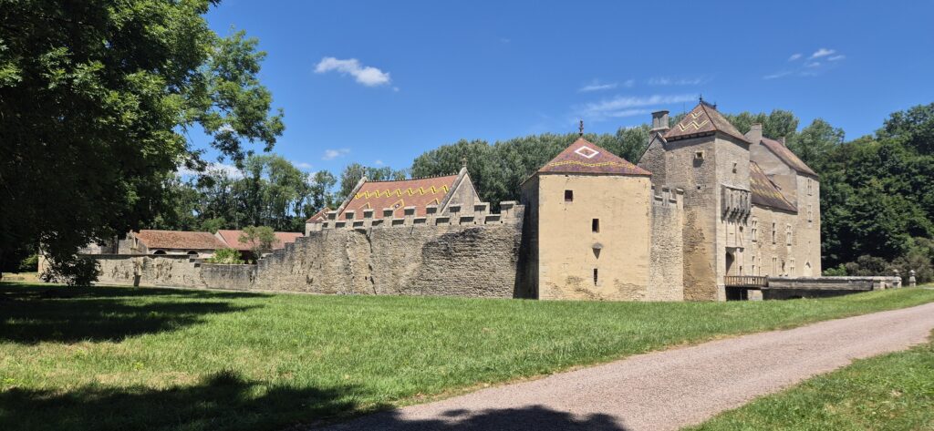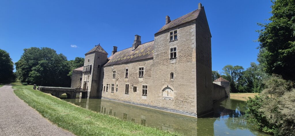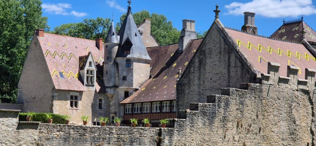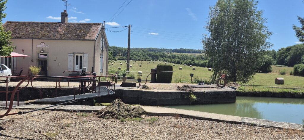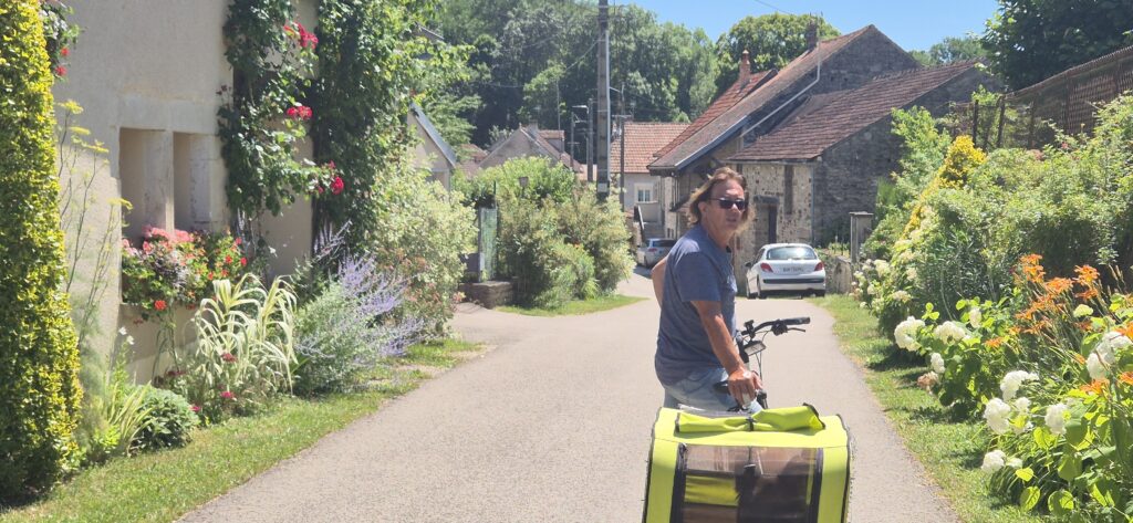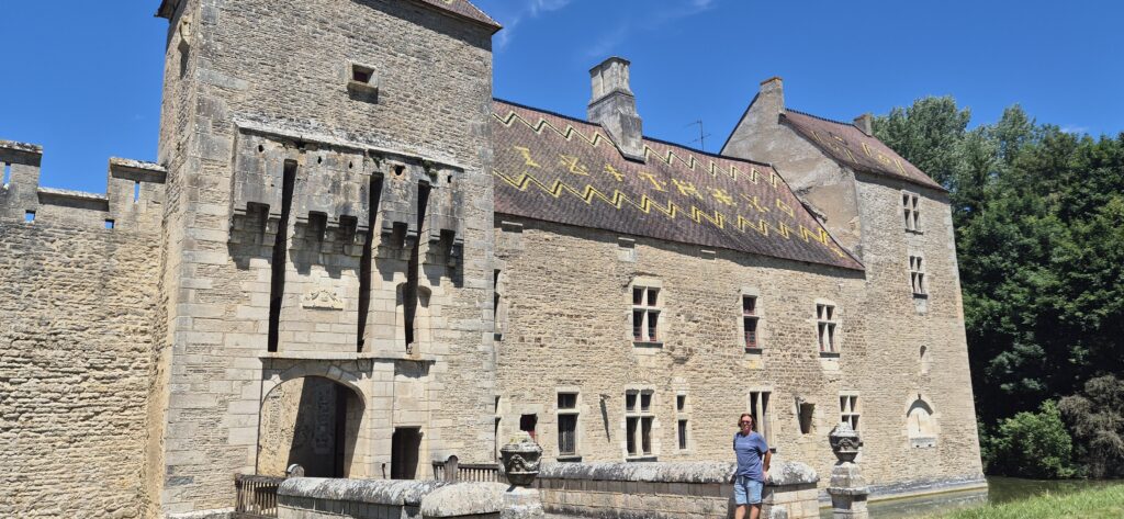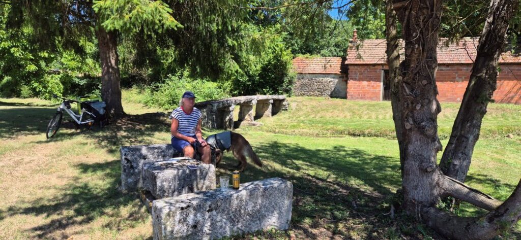 Mimo upału decydujemy się na wycieczkę do kolejnego chateau, tym razem będzie to zamek Marigny-le-Cahouet, w którym kręcono filmy o Angelice oraz Trzech Muszkieterów- Zemsta Milady (1961 r). Nad Francją mamy kolejną falę upałów na szczęście trasa wiedzie wzdłuż kanału więc nie jest stromo i spora część trasy jest ocieniona. Mamy do pokonania 12 km. Z małymi przystankami na uzupełnienie płynów zajmuje nam to godzinę. Ajra jedzie w kamizelce chłodzącej.
