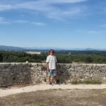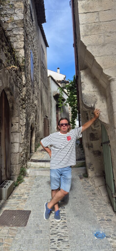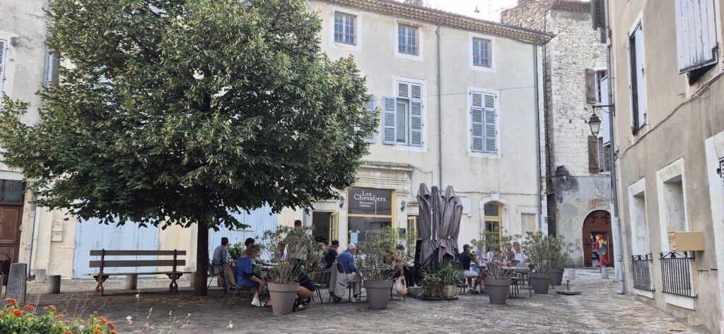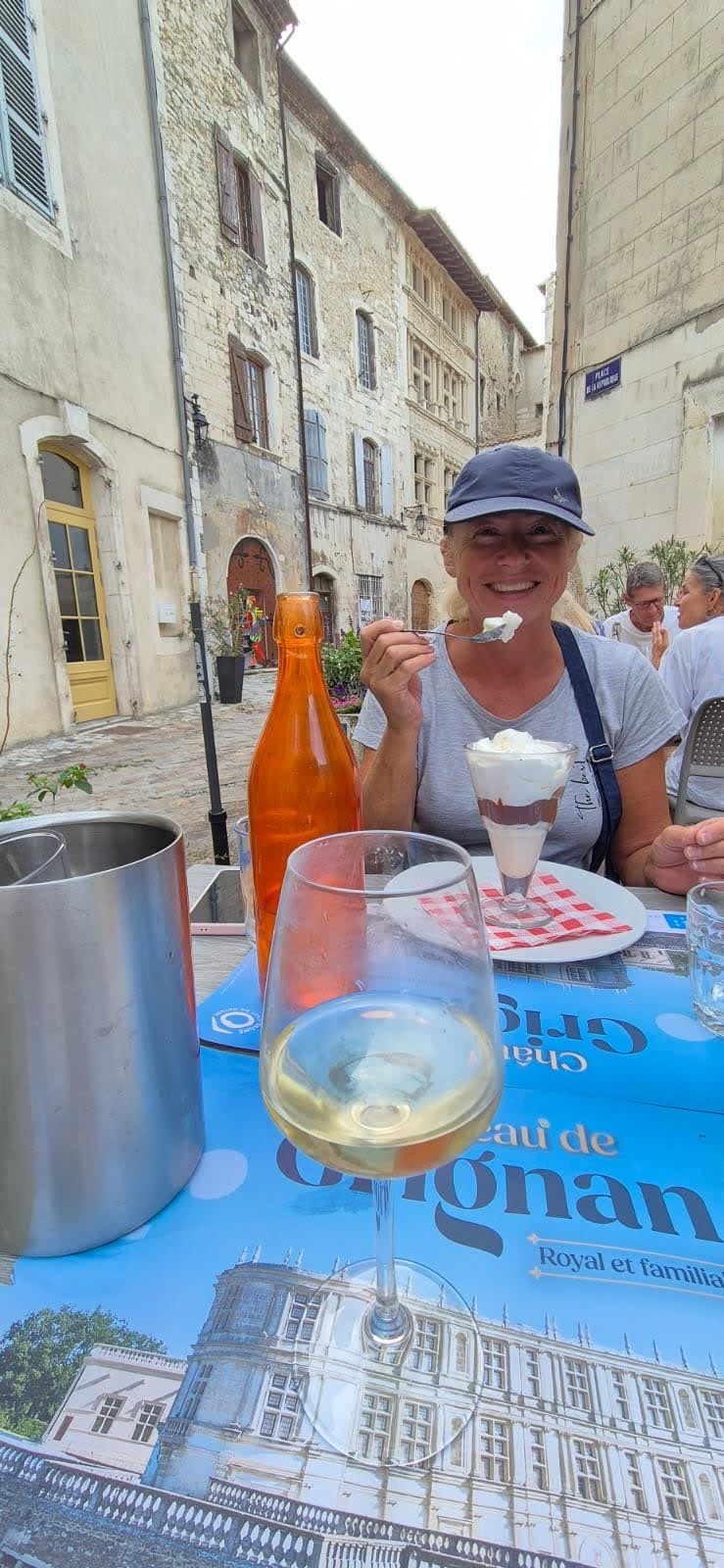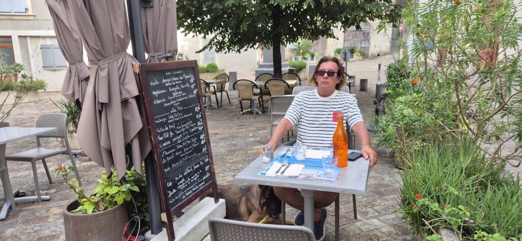 Trafiamy też na małą restaurację Les Chevaliers – właśnie taką jaką każdy chciałby odwiedzić we Francji. Na malutkim placu otoczonym średniowiecznymi domami, z dużym rozłożystym drzewem i stolikami ustawionymi na zewnątrz. Z dala od ruchu ulicznego. Jemy pyszną sałatkę Cezara, Kapitan spija wyśmienite winko produkowane 10 km dalej, Majtek wodę i Oranginę. Jutro płyniemy do Avignon.