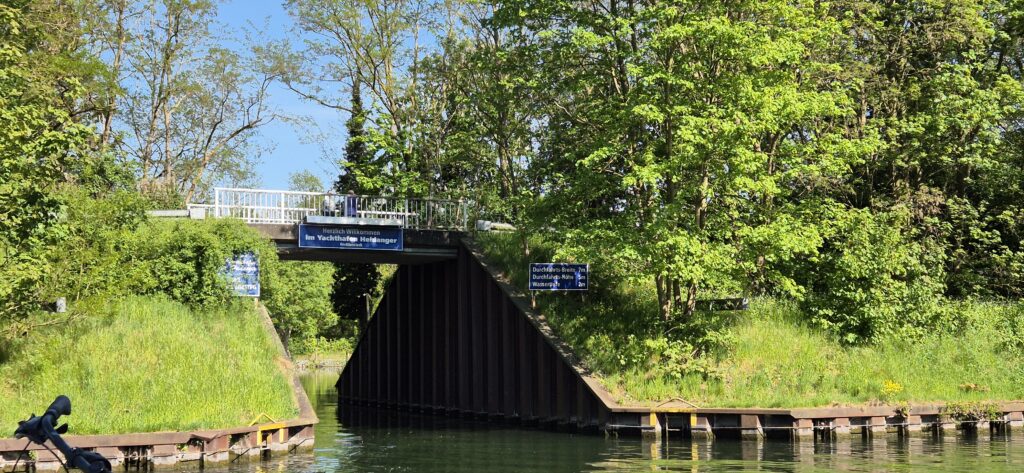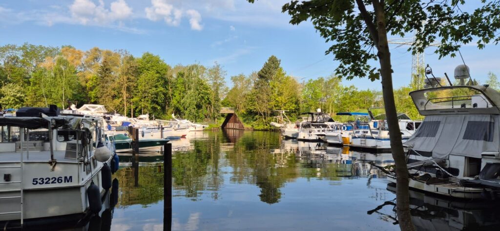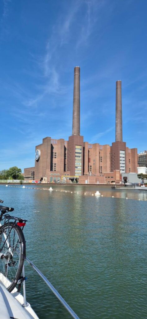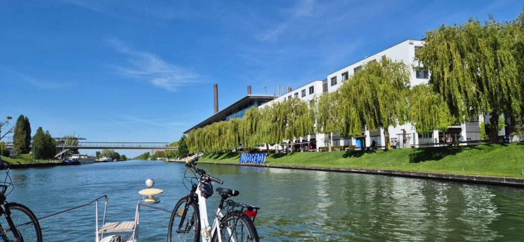 Okoliczne tereny usiane są ścieżkami rowerowymi z których tłumnie korzystają Niemcy w wolnym od pracy dniu. Po godzinie nadpływają barki a my słyszymy w głośniku komunikat o możliwości wejścia. Tym razem szukamy ruchomych polerów i mocujemy się do nich. Uprzejmy pan kapitan pod holenderską banderą wyłącza silniki co znacznie ułatwia nam podnoszenie się – nie ma hałasu oraz fali. W okolicach Brunszwiku na wodzie pojawia się sporo małych łódeczek, kajaki i oczywiście barki. Brzegami kanału cały czas suną rowerzyści. Wielu z nich ma wózeczki dla psów. Stajemy w marinie, która położona jest przy odnodze głównego toru. Po lewej stronie znajduje się wejście do kanału Salzgitter, który ma długość18 km a marina znajduje się po 3 km po lewej stronie. Kanał zbudowano w 1938 r. w celu połączenia dawnej huty „Hermann Goring” z niemiecką siecią dróg wodnych.