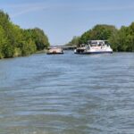 Przepłynęliśmy dziś 37 km w ciągu 4,5 godziny. Dwie dodatkowe zmarnowaliśmy na śluzę. Średnia prędkość 8,5 km. Średnie spalanie 4,2 l/ godz. Oczywiście moglibyśmy płynąć szybciej i czasem to robimy ale założona średnia wyprawy, która pozwoli nam w pół roku przepłynąć 6000 km jest utrzymana. Jesteśmy mocno obciążeni stąd takie spalanie. Wbrew pozorom płyniecie o 1 km szybciej niewiele zmienia a spalanie wzrasta o 2 litry na godzinę. Łatwo przeliczyć: mamy 600 godzin do przepłynięcia x 2 l (3euro) czyli…..no trzeba trochę pooszczędzać.