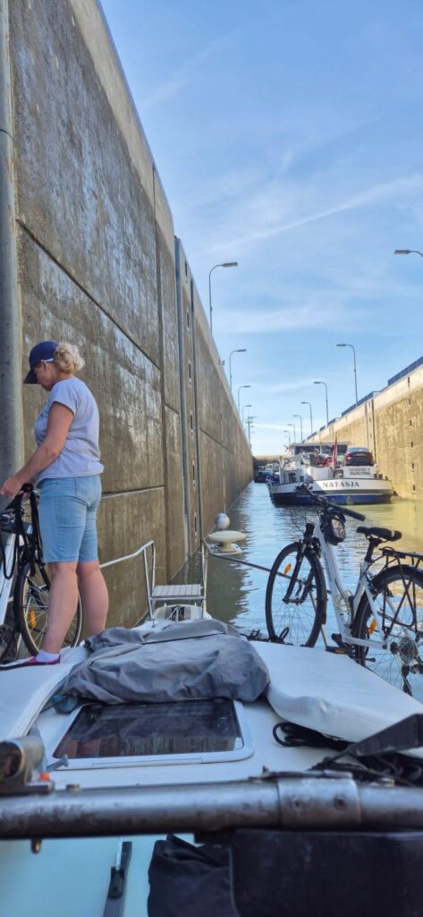 Przeprawa tą śluzą odbywa się razem ze statkami komercyjnymi więc trzeba być uważnym a w komorze należy zachować odległość 20 m od barki ponieważ najczęściej nie wyłączają silników. Na przejście musimy poczekać godzinę bowiem najpierw muszą dopłynąć barki a dopiero później możemy wejść my. Poczekalnia znajduje się po prawej stronie, nie ma pomostu. Musimy wydostać się na dosyć wysoki brzeg aby za pomocą głośnika zawiadomić obsługę. Sama śluza jest dwukomorowa. Stara komora została zbudowana w 1934 r., ma 6 zbiorników oszczędzających wodę i pokonuje różnicę poziomów 9 m. My będziemy się przeprawiali nową komorą oddaną w 2008 r. Ma ona długość 225 m i mieszczą się w niej dwie barki oraz max cztery łodzie turystyczne jak nasza.