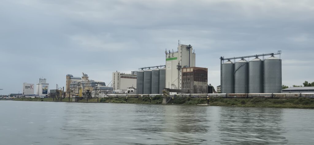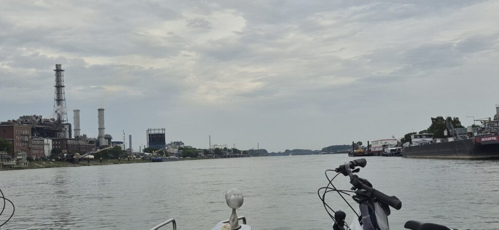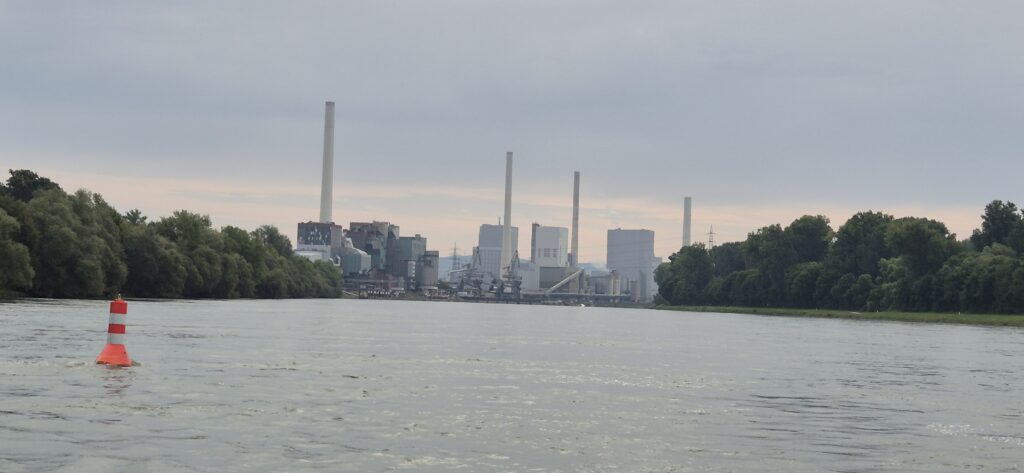 Nabrzeża Renu są bardzo przemysłowe, co rusz mijamy fabryki i elektrownie. Na trasie w okolicach 480 km mamy w bocznym kanale nawodną stację benzynową więc podpływamy aby nakarmić Hooka. Jest to „filia” zlokalizowanej na nabrzeżu tradycyjnej stacji, niestety dystrybutor 95 jest zepsuty. W ruch zatem idą kanistry bo skoro już zacumowaliśmy to szkoda straconego czasu.