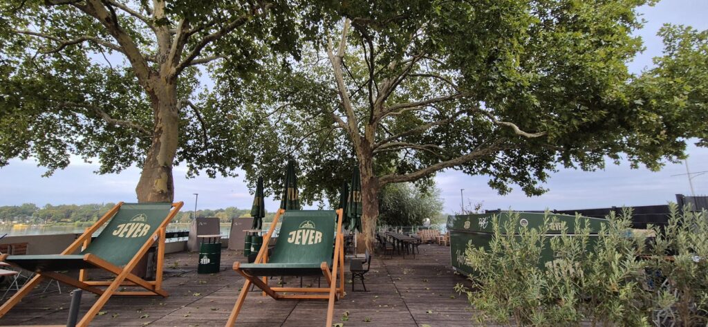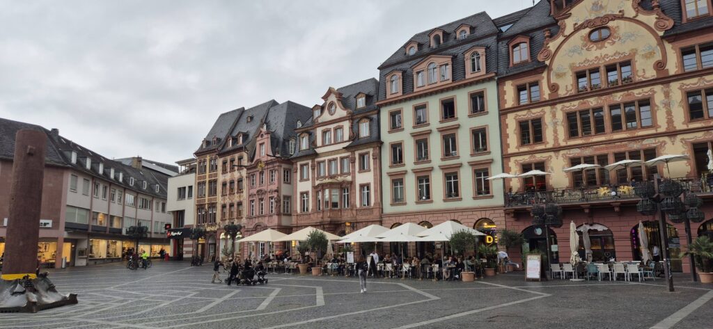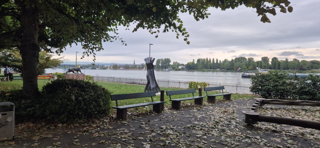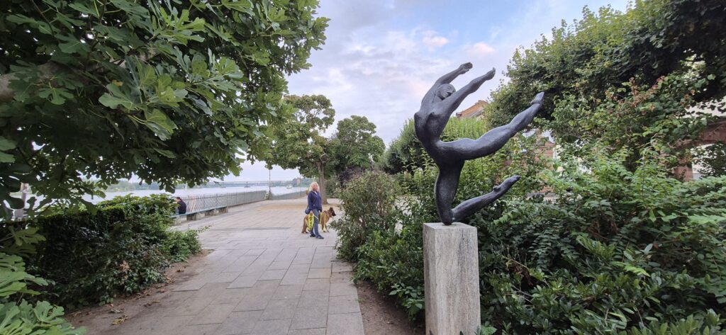 Mimo późnej pory ruszmy na spacer – starówka oddalona jest od portu o jakieś 15-20 minut spacerem. Promenada nad Renem jest pięknie zagospodarowana, są ławki, ścieżki rowerowe, ekspozycja rzeźb, miejsca na ogniska i sporo restauracji.