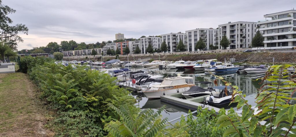 Portów w Mainz jest kilka ale my wybieramy Yacht Club Mainz z uwagi na jego lokalizację. Basen położony jest tuż naprzeciwko wejścia na Man więc unikniemy dzięki temu jutro rano płynięcia pod prąd. Udaje nam się zająć ostatnie wolne wolne miejsce. Port jest klubowy i miejsca dla gości oznaczane są przez właścicieli zielonymi tabliczkami informującymi jak długo dana keja będzie wolna. Wejście chronione jest dwoma bramkami na kod. Na budynku klubu znajduje się skrzynka z kopertami, w których umieszcza się opłatę jest też podany kod do elektronicznych zamków.