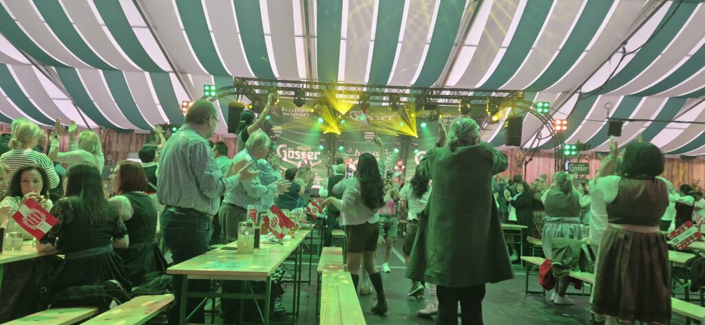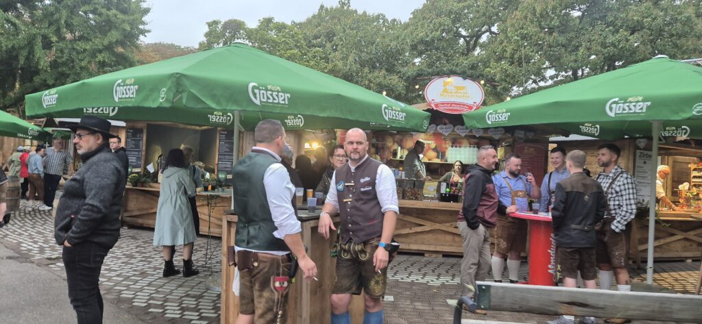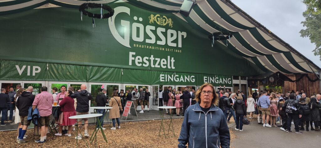 Są oczywiście klasyczne kiełbaski, golonki i sznycle. Kufel olbrzym kosztuje 15 e. Wejście na teren imprezowy jest w większości namiotów bezpłatny ale są też takie gdzie konieczny jest zakup biletu bądź wcześniejsza rezerwacja. Spora część osób przybywających na wydarzenie jest ubrana w tradycyjne austriackie stroje a jak ktoś nie ma a ma ochotę w takim wystąpić można nabyć na miejscu. Ludzie bawią się przednie. My również.