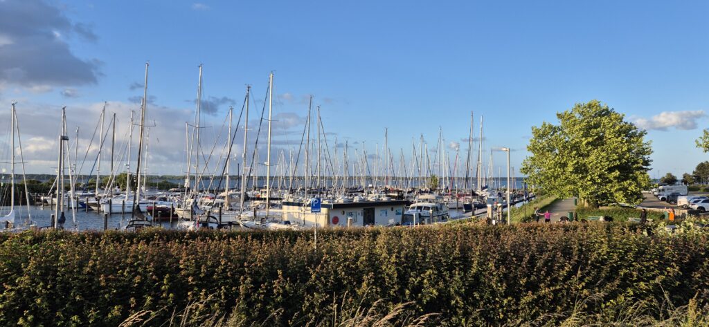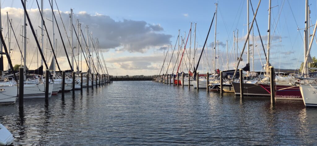 Sprzyjające nam prądy wodne sprawiły, że do celu dotarliśmy już o 15. Wejście do portu okazało się niełatwym zadaniem bowiem wiało z prędkością 45 km/h. Port do tanich nie należy (24 e) ale jest bardzo wygodny i w cenie mamy wszystko, nawet prąd pozwalający na zagotowanie wody w czajniku. Ma trochę morski charakter, otoczony jest wysokim falochronem a tuż obok stoi latarnia morska, której światło ostatni raz rozbłysło w 1989 r.