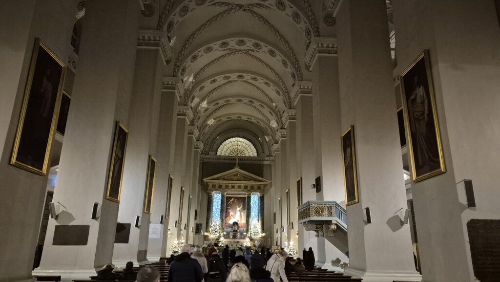 Apartament, choć z zewnątrz niepozorny jest fantastyczny. Przestronny, gustownie urządzony i co najważniejsze – leży 200m od placu Katedralnego! Jest piętnasta, szukamy z Ajrą skweru/trawniczka w oczywistym celu. Najbliżej zlokalizowana zielona przestrzeń znajduje się między katedrą a muzeum narodowym czyli jest to top trawnik w Wilnie. Po załatwieniu psich spraw udajemy się do katedry aby zdążyć przed nabożeństwem o 17.30.