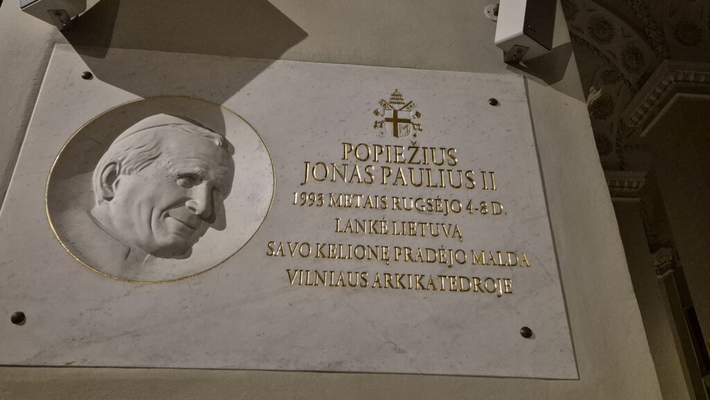 W 1993 r. Jan Paweł II jako pierwszy papież odwiedził Litwę, a w środkowej części katedry po lewej stronie znajdziemy tablicę upamiętniającą to wydarzenie.