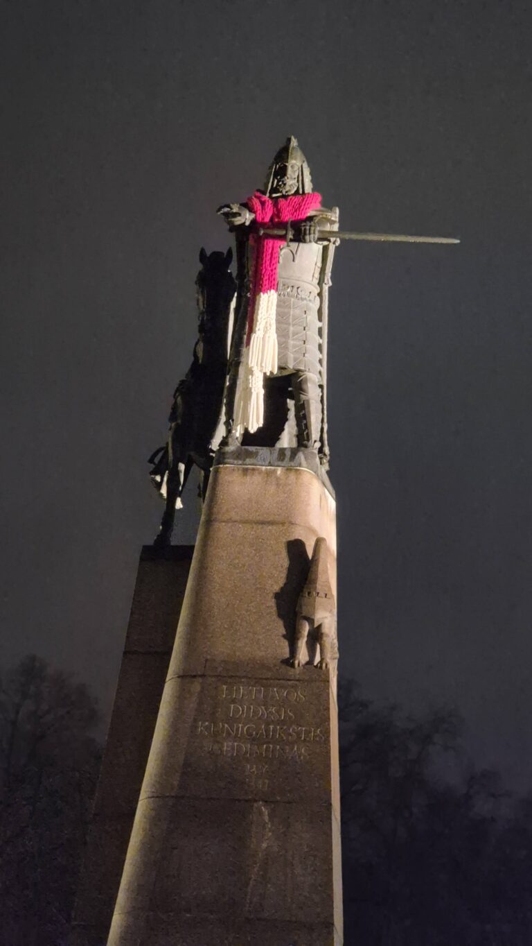 Na placu jako obowiązkowy punkt wycieczki znajduje się pomnik Giedymina, założyciela Wilna. Kiedy Giedymin spał zmęczony harcami na polowaniu przyśnił mu się wyjący na wzgórzu wilk w żelaznej zbroi. Pogański kapłan orzekł, że wilk jest symbolem miasta, które ma zbudować w tym miejscu. Więc powstało Wilno a na placu stoi sobie Giedymin, obok jego koń a na dole wilk. Założyciel miasta odziany jest w piękny czerwono biały szal, mamy przecież grudzień.