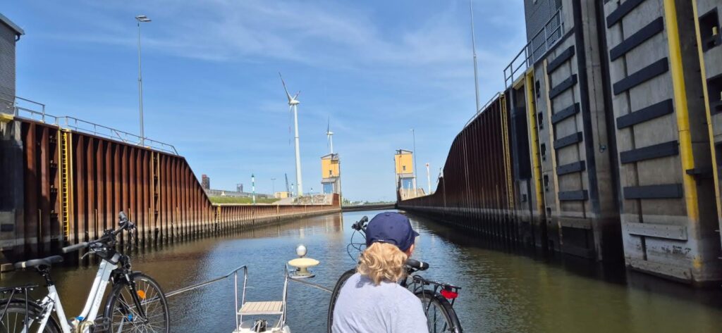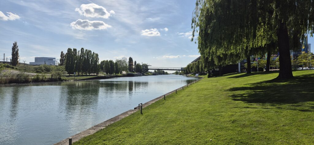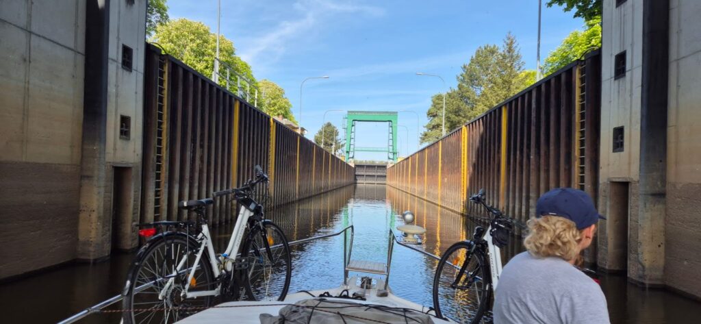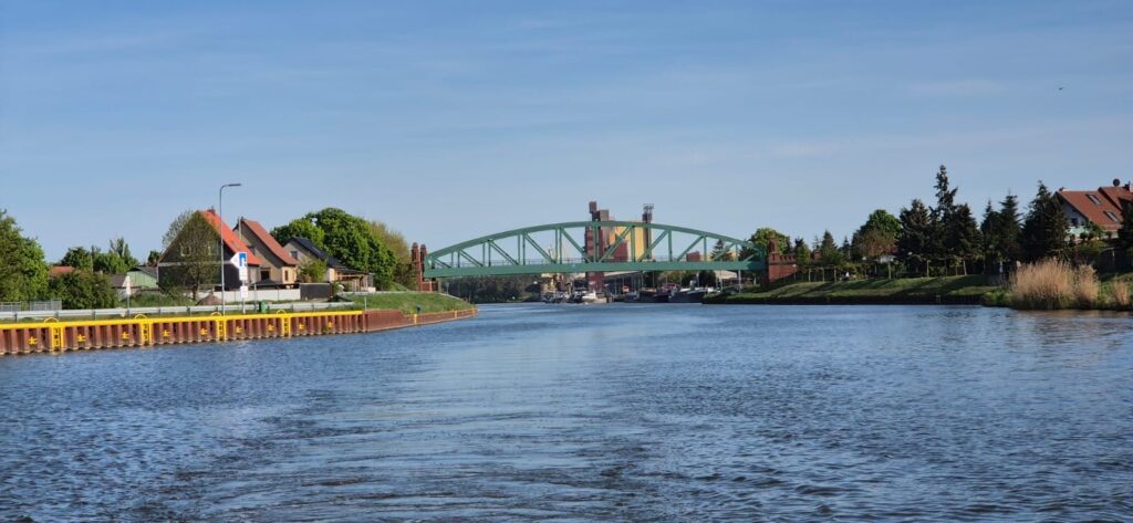Kolejna śluza to Zerben. Tu również nie czekamy i podnosimy się 2 m w górę. Od tego momentu przed nami rozpościera się bardziej industrialny krajobraz. Przy nabrzeżach zlokalizowane są fabryki, małe porty kontenerowe, co rusz mijamy olbrzymie barki. Wzdłuż biegu rzek i kanałów cały czas biegną ścieżki rowerowe. Oczywistym więc wydaje się fakt, że skoro tutaj transport rzeczny i turystyka kwitnie to po co ma się rozwijać u nas, zabierając cenne euro z landów niemieckich. W Polsce niechaj będą rezerwaty rzeczne i to najlepiej takie z zakazem wstępu dla ludzi. Ścieżki, o których mowa wyżej są bardzo zadbane, część jest wyasfaltowana a te szutrowe są równe i wykoszone. Nie ma sterty śmieci, każdy może bez najmniejszego problemu do nich dotrzeć.