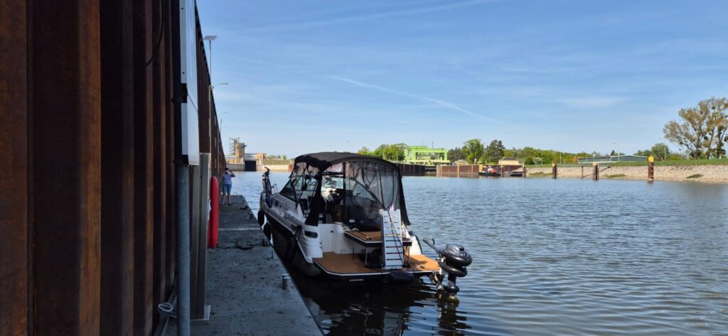 Przed nami śluza gigant Rothensee gdzie będziemy się wyciągać na 18 m w górę. Poczekalnia z bardzo małym pomostem znajduje się po lewej stronie. Pani śluzowa z szybkością karabinu maszynowego przekazuje informacje – nie rozumiemy się ale po chwili mamy zielone światło. Stajemy w komorze po prawej stronie i mocujemy do polera – będziemy musieli w trakcie podnoszenia kilkukrotnie przekładać cumę. Po zamknięciu wrót widzimy po lewej pływające polery i żałujemy naszego gapiostwa bowiem jest to bardzo wygodna metoda śluzowania. Raz założona cuma i spokój na cały czas wyciągania w górę.