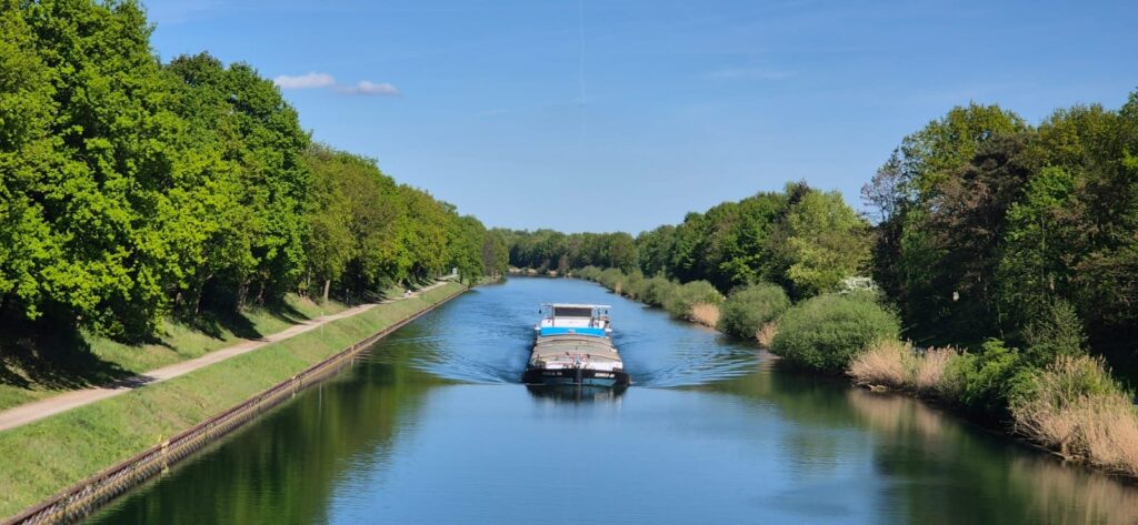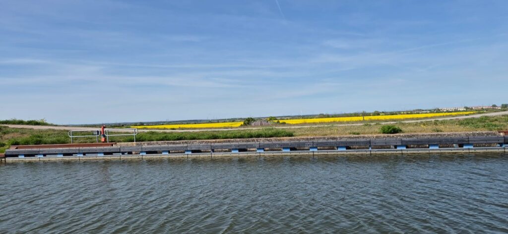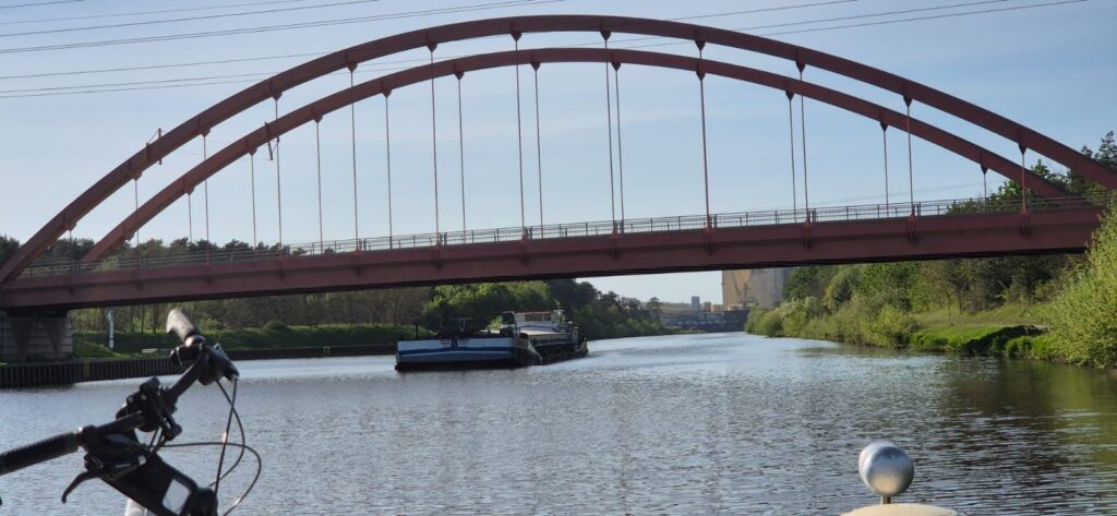 Wpływamy na Mittellandkanal czyli Kanał środkowoniemiecki. W kolejce na przeprawę po lewej stronie czekają cztery olbrzymie barki. Kanał ten jest najdłuższym śródlądowym kanałem w Niemczech i jedną z najważniejszych dróg wodnych w Europie. Ma długość 325 km i łączy zachodnią i wschodnią część Niemiec bez konieczności korzystania z naturalnych, często trudnych w żegludze rzek. Kanałem transportuje się głównie węgiel, stal i zboża. Budowę tej drogi wodnej rozpoczęto już w 1906 r. Kanał na tym odcinku ma kamieniste brzegi, głębokość ok. 4 m a szerokość 50-60 m. Płyniemy pod prąd. Marina Sportboothafen Calvorde znajduje się po lewej stronie. Na krótkim odcinku przed portem głębokość zwiększa się nawet do 8 m. W dotychczasowym rankingu marin na naszej trasiet a jest w czołówce bowiem: