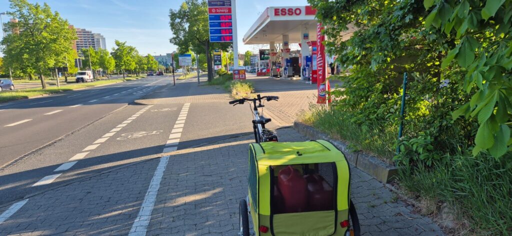 W odległości 800 m od portu znajduje się stacja benzynowa i to dzisiaj wypada ten straszny dzień, kiedy trzeba uzupełnić bak. W celach transportowych użyty zostanie wózeczek Ajry, na którym udaje się przewieźć jednorazowo 60 l. Kursów będzie trzy, więc cała operacja jest czasochłonna o obciążeniu karty nie wspominamy. Z pozytywnych informacji mamy to, że droga do stacji biegnie ścieżką rowerową a przy powrocie z obciążeniem Krzysiek jedzie z górki.