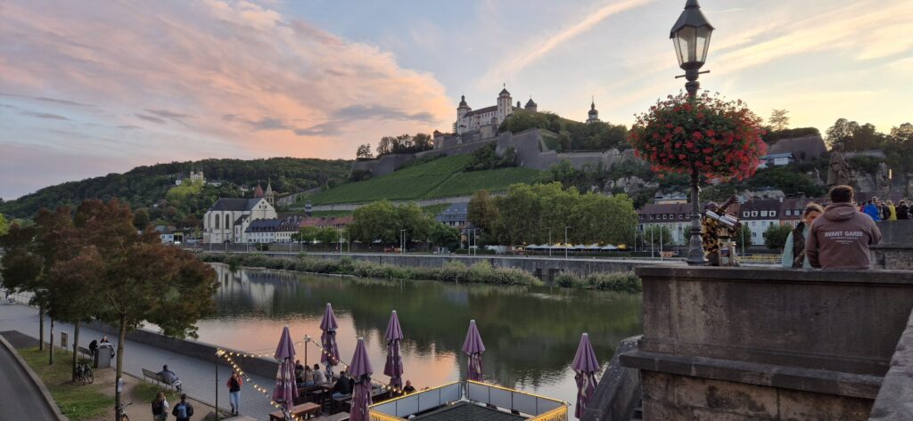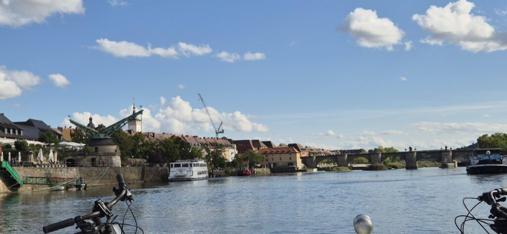 Do mariny wracamy przechodząc przez Alte Mainbrucke – most, który stoi w miejscu dawnej przeprawy rzymskiej. Na barokowych balustradach ustawiono 12 figur świętych, o których mieszkańcy mówią „mostowi patroni”. Most jest deptakiem, ludzie kupują kieliszek wina w pobliskiej winotece i popijając trunek podziwiają widoki. A jest co.