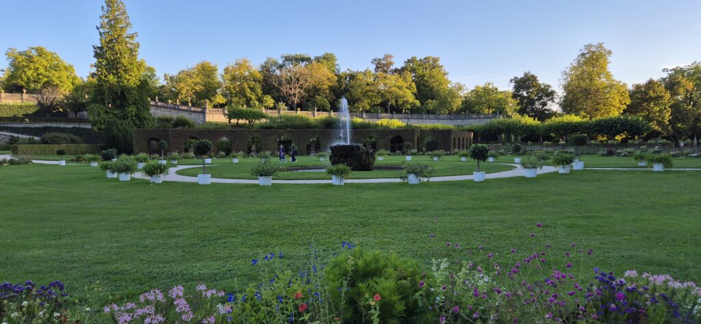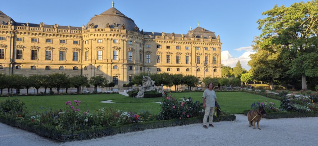 Najważniejszym zabytkiem jest Rezydencja w Wurzburgu, która była siedzibą książąt-biskupów frankońskich. Byli to wyjątkowi władcy bo mieli podwójną władzę: duchową i świecką. Budowę rozpoczęto w 1720 r. a budynek miał rywalizować z Wersalem i Hofburgiem. Najsłynniejszym elementem jest klatka schodowa z największym na świecie sufitowym freskiem. Nam nie uda się go zobaczyć ale możemy podziwiać budowlę z zewnątrz i ogrody rezydencji, które otwarte są za darmo i można do nich wejść z psem. Całość robi piorunujące wrażenie. Przed powstaniem rezydencji biskupi mieszkali w twierdzy Marienberg, która znajduje się na wzgórzu tuż przy marinie.