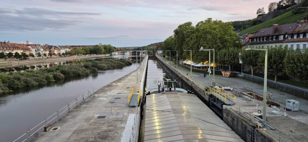 Na śluzach bywa różnie, jedne przechodzimy gładko, na innych czekamy na „big shipy”. Najbardziej spektakularne śluzowanie odbywa się w Wurzburgu bowiem komora śluzy znajduje tuż przy sławnym moście Alte Mainbrucke skąd na podnoszące się statki spogląda tłum ciekawskich.
