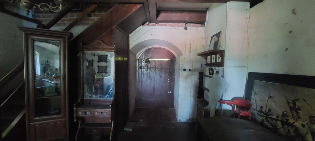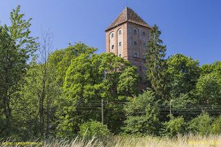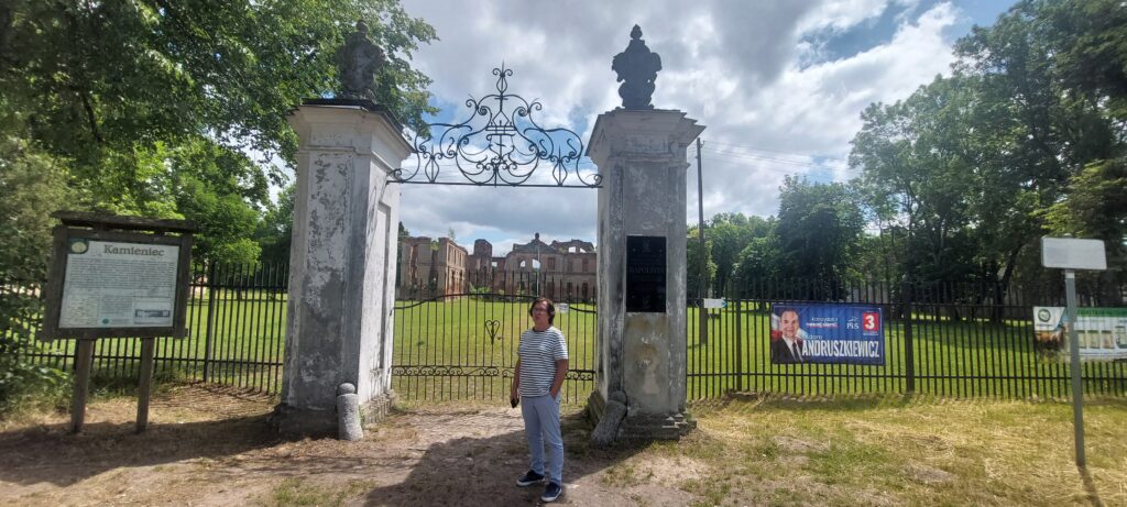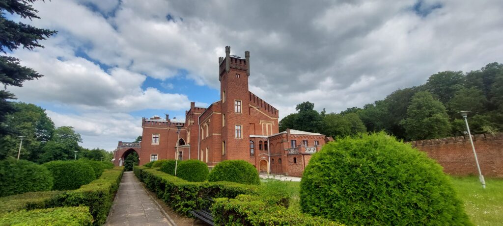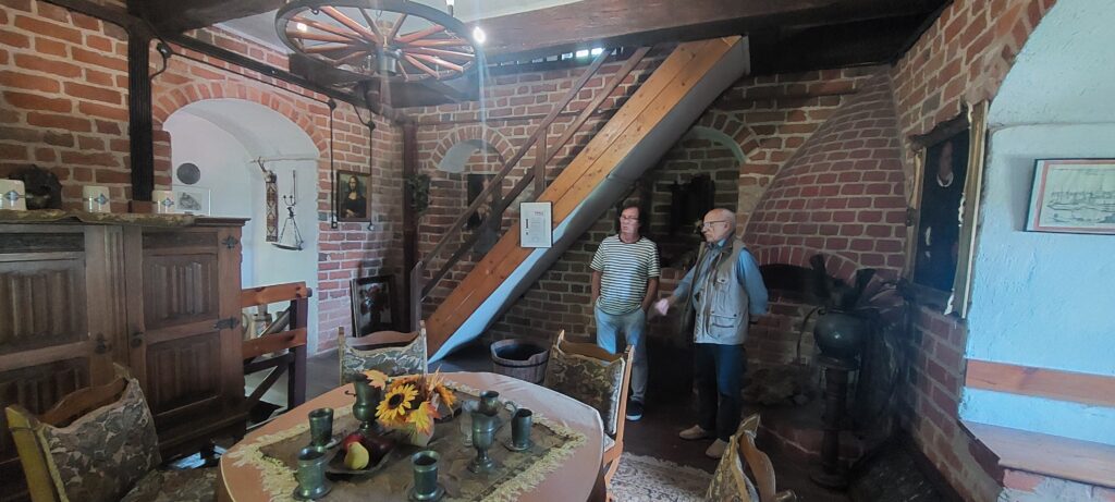 Tak więc Szymbark. Odległość od naszego portu niecałe 9 km. Zamek został zbudowany w XIVw i śmiało mógł konkurować z Malborkiem. Na nas zrobił niesamowite wrażenie. Od 1699r należał do znanego pruskiego rodu Finck von Fickenstein, który generalnie na brak gotówki nie narzekał. W latach 30 XXw. obok zamku znajdowały się korty tenisowe, była elektryczność, telefon, również wewnętrzny, instalacja wodno-kanalizacyjna. Generalnie było „jakby luksusowo”. Zamek został zniszczony przez „wyzwolicieli” w 1945r. Dziś jest w rękach prywatnych i zwiedzać go można jedynie z zewnątrz. Przed bramą znajduje się tablica z kodami QR, dzięki którym otwiera nam się wirtualny przewodnik. My spotkaliśmy też miejscowego gawędziarza, który opowiedział nam o zakopanym skarbie i Napoleonie, który tu bywał ale wolał inną posiadłość Fickenstein’ów a mianowicie Kamieniec.